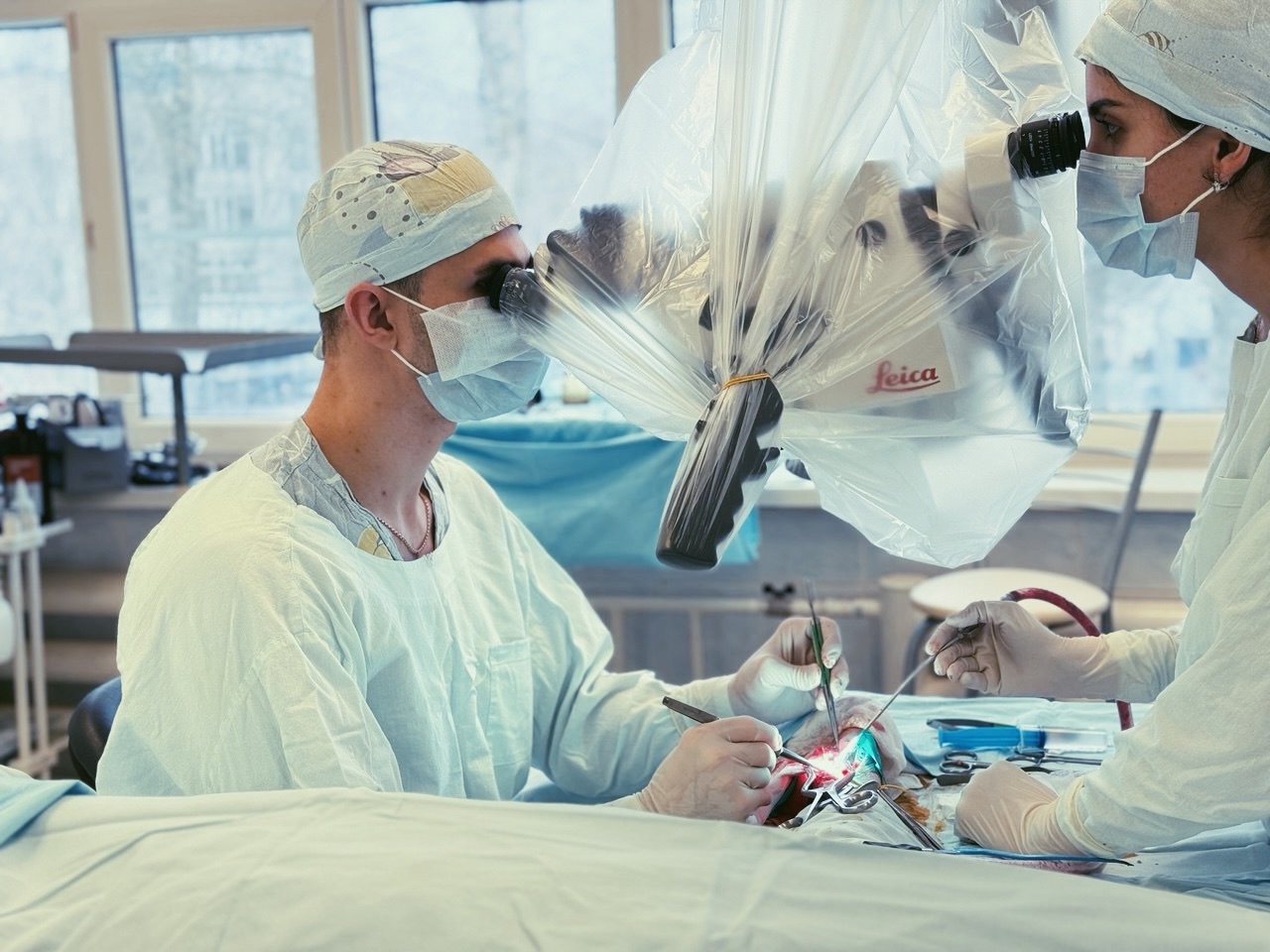 Операция выполняется под большим увеличением операционного микроскопа. Используя микрохирургические инструменты и сверхтонкий шовный материал.